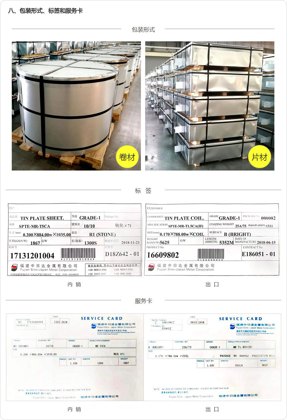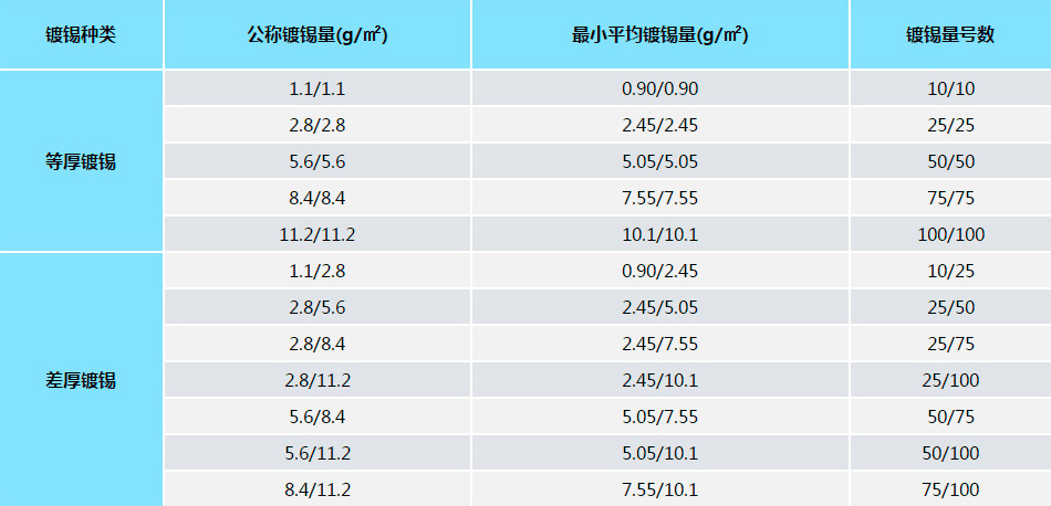 (1)鍍錫量是根據產(chǎn)品最終用途決定。鍍錫量高的馬口鐵用于耐腐蝕性要求高的罐子或無(wú)涂裝使用。鍍錫量低的馬口鐵用于耐腐蝕性要求低的罐子或經(jīng)涂裝、印刷后使用。